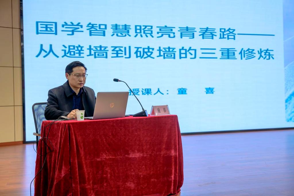 开班仪式后,童喜以《国学智慧照亮青春路——从避墙到破墙的三重修炼》为题开展专题授课,将马克思主义青年观与中华优秀传统文化深度融合,为青马学员量身打造了一堂兼具思想深度与实践指导的成长课,为青年成长成才指明方向。授课以“三墙之问”为切入点,围绕古人“君子不立于危墙之下”与“不撞南墙不回头”的看似矛盾古训,深挖背后蕴含的递进式人生智慧,从“避墙之智:学业立基”“撞墙之勇:职业立业”“破墙之境:人生立心”三个维度,系统阐释了青年成长的三重修炼路径。讲座结合孔子、王阳明、曾国藩等先贤的经典思想,精准剖析当代青年在学业、职业、人生阶段面临的惰性、从众、自我设限等成长困境,提出“三墙三立”的实践要求,引导学员以理性预判规避学业危墙,以长期主义和理性思考直面职业挑战,以柔性智慧突破内心之墙,将国学智慧转化为立身、立业、立心的实际能力,建立属于自己的人生内在秩序。